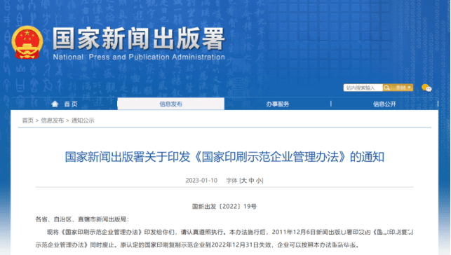 2023年1月10日,國家新聞出版署官網(wǎng)發(fā)布《國家印刷示范企業(yè)管理辦法》,2011年12月6日新聞出版總署印發(fā)的《國家印刷復(fù)制示范企業(yè)管理辦法》同時廢止。原認(rèn)定的國家印刷復(fù)制示范企業(yè)到2022年12月31日失效,企業(yè)可以按照本辦法重新申報。《辦法》提出,國家印刷示范企業(yè)分為四類:保障支撐類、創(chuàng)新引領(lǐng)類、智能制造類、專業(yè)特色類。國家新聞出版署每兩年組織開展一次國家印刷示范企業(yè)的評審認(rèn)定。